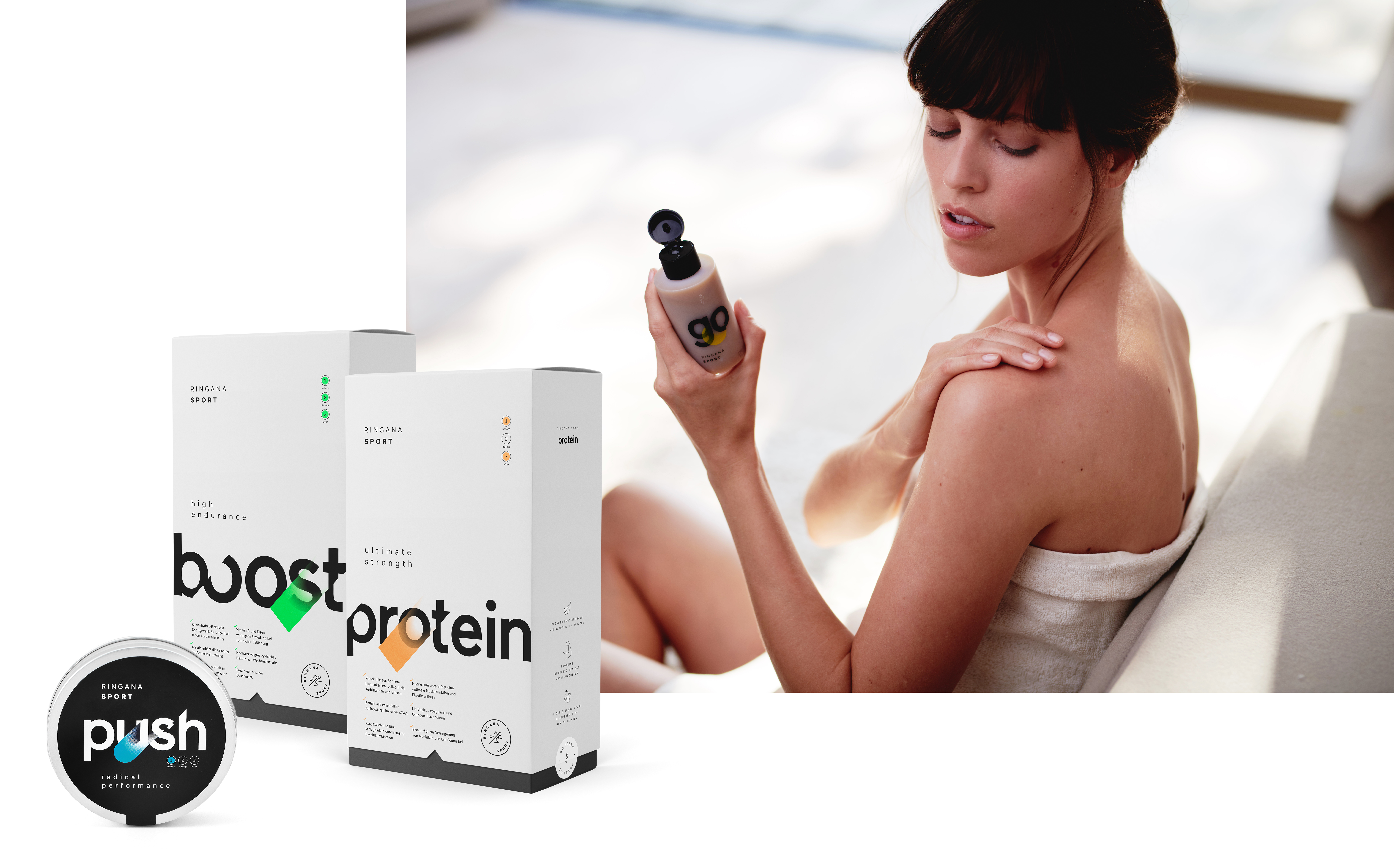 Naturalmente puoi sostenere il corpo per l’allenamento anche dall’interno. RINGANA offre una gamma di integratori che garantiscono al corpo l’apporto di tutte le sostanze necessarie prima, durante e dopo lo SPORT.