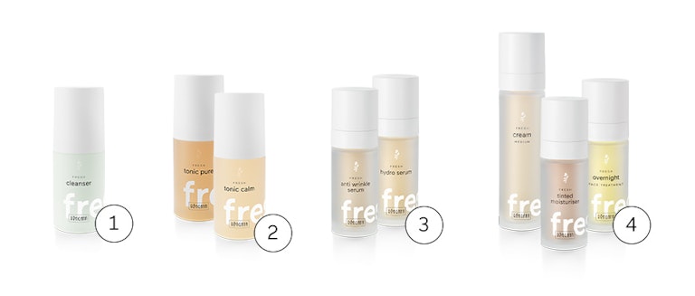 Zuerst beginnt die Reinigung mit dem FRESH cleanser, anschließend erfolgt die Klärung der Haut mit einem Tonic: FRESH tonic calm beruhigt trockene und normale Haut, FRESH tonic pure hingegen klärt ölige und unreine Haut. Um der Haut Feuchtigkeit zu spenden, wird in einem dritten Schritt das FRESH hydro serum oder das FRESH anti wrinkle serum aufgetragen. Nachdem alles gut eingezogen ist, kommen morgens FRESH cream und/oder FRESH tinted moisturiser und abends die FRESH overnight treatments zum Einsatz. Alle Schritte im Detail findest du hier.