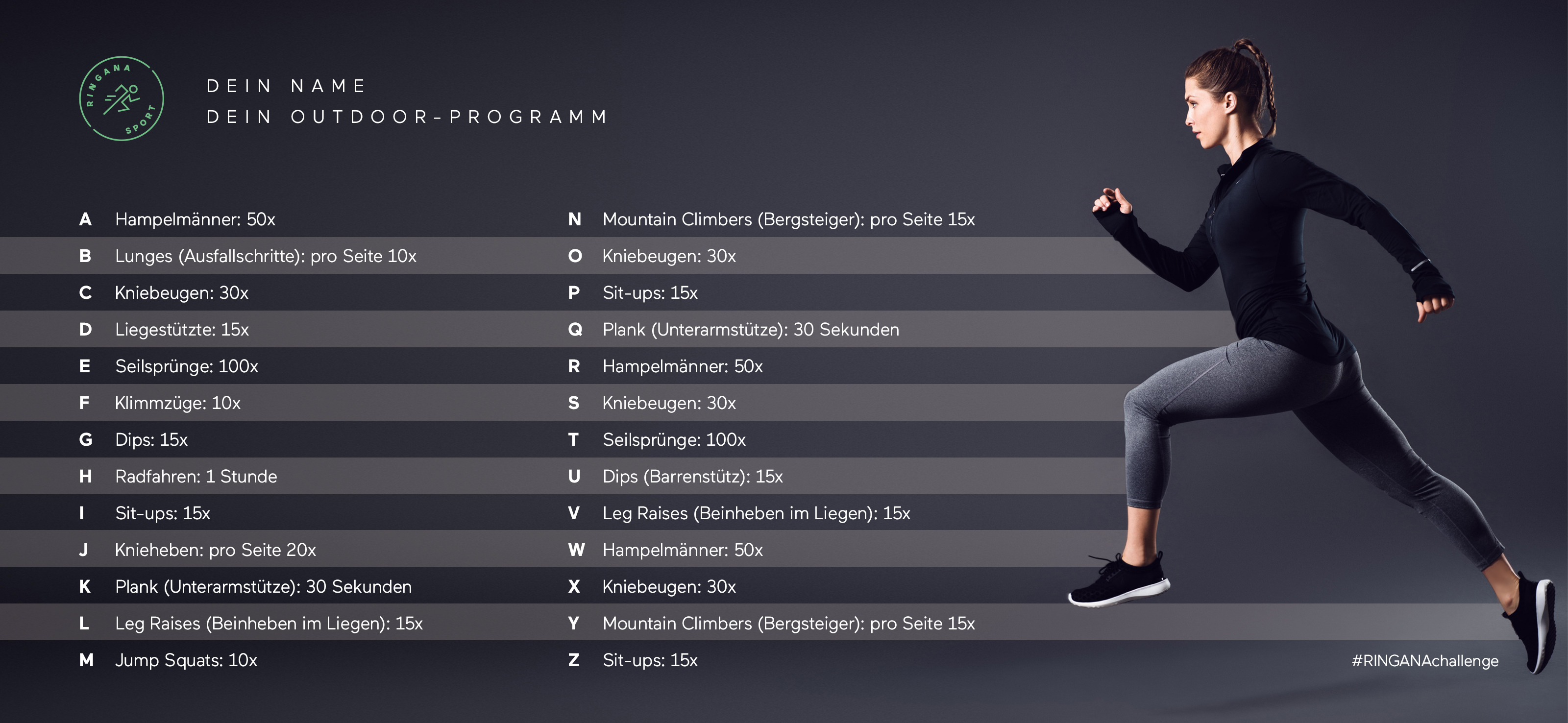Ab ins Freie: Parks, Gärten, Felder, Wälder – die Welt steht dir offen. Benötigst du noch eine Workout-Idee oder einen kleinen Ansporn? Wir haben eine Challenge für dich: Dein Name = Dein Outdoor-Programm.