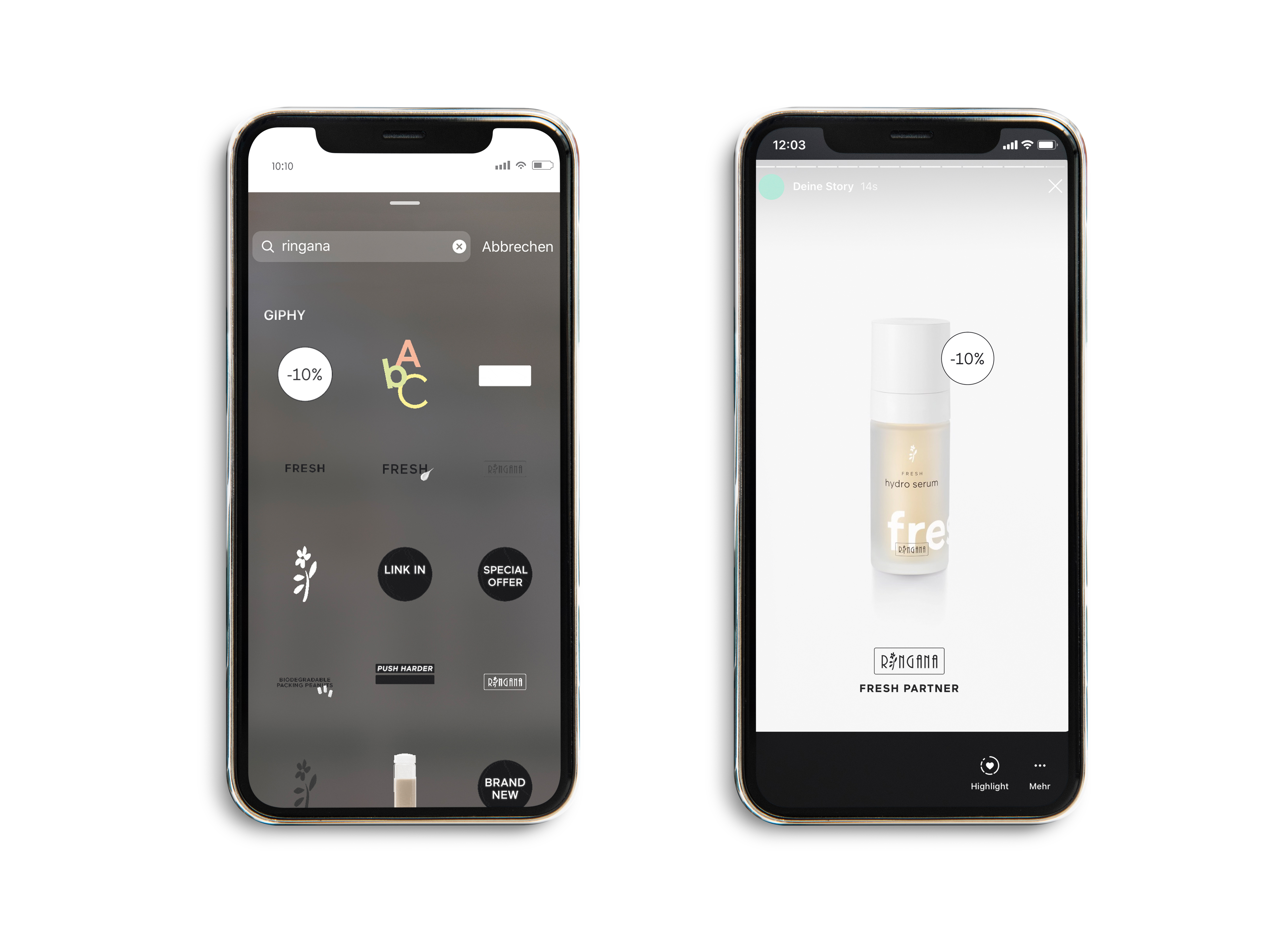 Bezvadnou novinkou je, že od nynějška má RINGANA vlastní výběr samolepek na instagramu. Tyto samolepky je možné používat v kombinaci s obrázky produktů pro Vaše instagramové příběhy. Pokud chcete upozornit na speciální nabídku produktu nebo na 10% slevu, naleznete tam vhodnou samolepku. Avšak nejlépe uděláte, když si vezmete do ruky mobil a přesvědčíte se sami. Zapněte si k tomu Váš instagramový účet a vyberte nahoře vlevo funkci „tvé story“. Pokud jste si již stáhli naše hotové obrázky produktů pro instagramové příběhy, pak si z nich můžete jeden obrázek vybrat. V dalším kroku si můžete v horní části Vaší obrazovky přidat samolepky. Nyní zadejte do vyhledávače samolepek „RINGANA“ a vyberte si s ohledem na Váš úmysl z nabídky vhodnou samolepku.