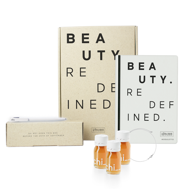O kit inclui o RINGANAchi__x3 que pode saborear durante o evento, um prático notebook da marca Moduletto com os dados fundamentais da Convenção Virtual e uma RINGANA ballpoint pen para anotar as informações mais importantes. Também está incluída uma moderna pulseira em tecido com a flor RINGANA. O resto é top secret!